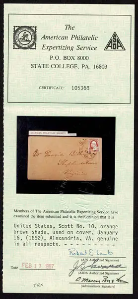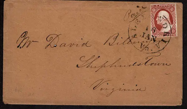 UNITED STATES: Virginia; 1851 3c orange brown type II ,good to clear margins all around. Bright red color and impression tied by ALEXANDRIA VA 16 JAN c.d.s. on manila local envelope, manuscript “paid” to Shiplandstown Va . Ex Saadi. APEX Cert (1997).