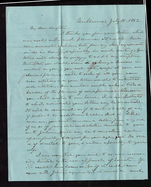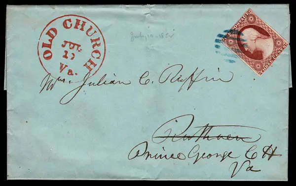 UNITED STATES: Virginia; 1857 3c brownish carmine Plate 1L ,margins mostly all around touching frame-line in places, tied by cute blue bar cancel on folded letter (date -lined 1852) bearing lovely red OLD CHURCH VA JUL 10 c.d.s., readdressed to Prince George CH Va. Very attractive letter to their daughter . Ex Saadi.