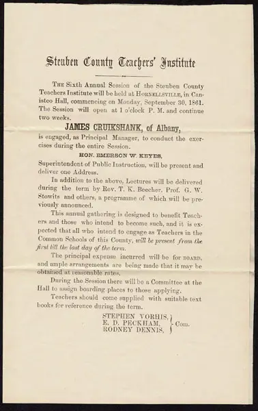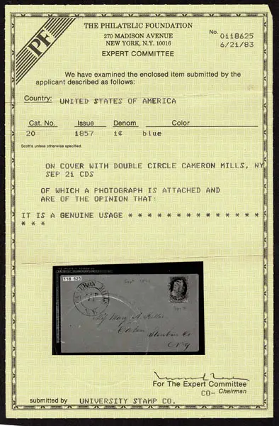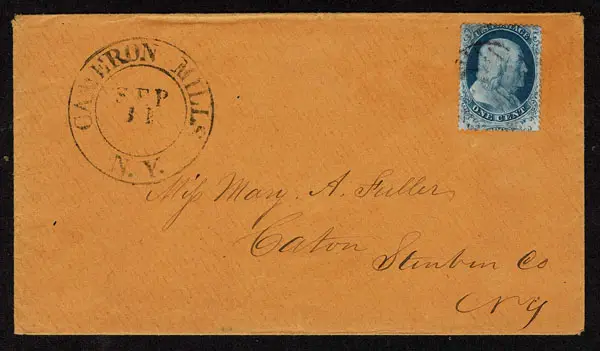 UNITED STATES: 1857 – 67 1 c blue, Plate 2, a fine copy just tied by grid cancel on fresh ,(1861) manila envelope bearing large double circle CAMERON MILLS SEP 21 NY c.d.s. to nearby Canton, printed enclosure announcing the Stuben County Teacher’s Institute featuring speaker James Cruikshank. Very pretty . Foundation Cert. (1983) . (20)… $340