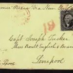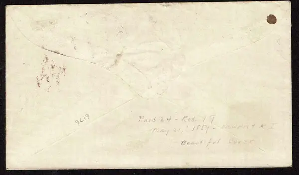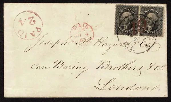 UNITED STATES: Used to England; 1857 12c black Plate 1, HORIZONTAL PAIR ,tied by large NEWPORT RI 1859 c.d.s. on off white envelope addressed to Joseph Hazard, care of the Baring Brothers (merchant bank) known in the Browning correspondence, the envelope bears a red 19 matching circular PAID 24 and PAID UK JU 4 59 receiver. Quite attractive . (36)… $850