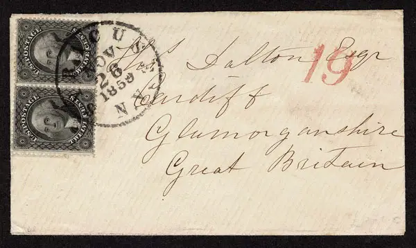 UNITED STATES: Used to England; 1857 12c black Plate I HORIZONTAL PAIR ,tied by large SYRACUSE NOV 26 1859 c.d.s. on neat off white envelope (top flaps a bit torn) bearing red 19, to Glamorganshire England . (36)… $850