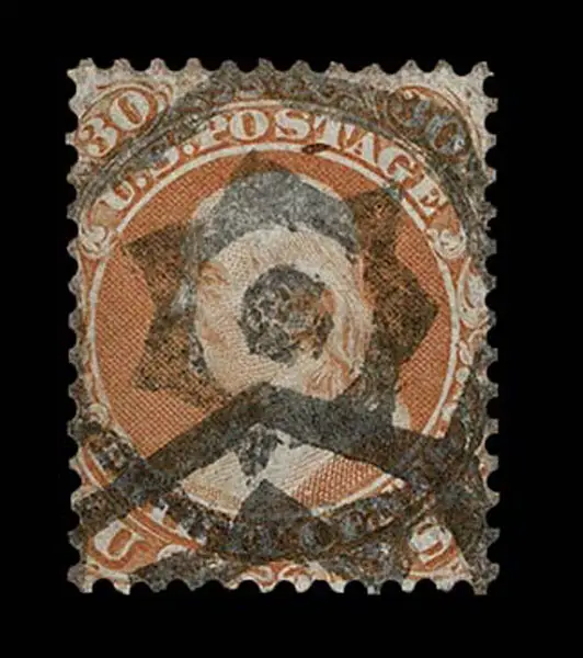 - Lot 120 – UNITED STATES: 1861 30c orange with black New York Foreign Mail “Octagon with Cogged Wheel Center” cancellation