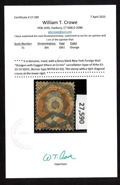 O UNITED STATES: 1861 30c orange with black New York Foreign Mail “Octagon with Cogged Wheel Center” cancellation ,light diagonal crease . Crowe Cert.(2025).