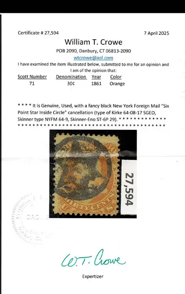 O UNITED STATES: 1861 30c orange, black New York Foreign Mail “Six Point Star Inside Circle. “Pictoriai” cancellation .lovely cancel . Crowe Cert.(2025).