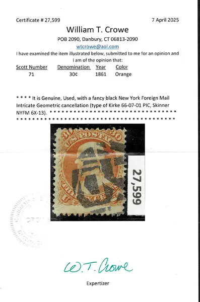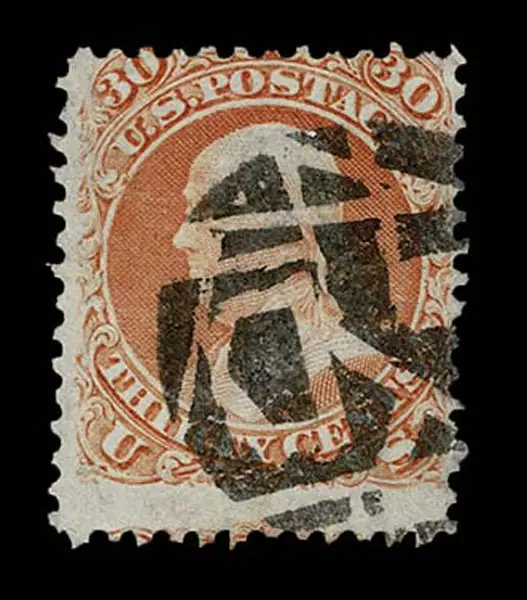 Lot 129 – UNITED STATES: 1861 30c orange, black New York Foreign Mail “Intricate Geometric” cancellation
