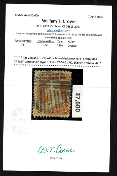 O UNITED STATES: 1861 30c orange, black New York Foreign Mail “Shield” cancellation ,nicely centered . Crowe Cert.(2025).