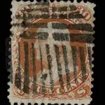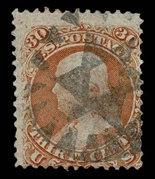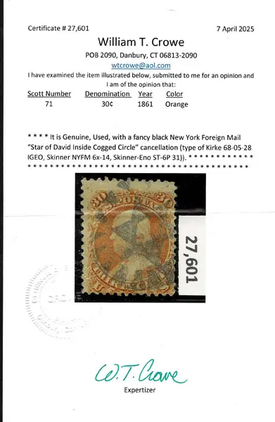 Lot 131 – UNITED STATES: 1861 30c orange, black New York Foreign Mail “Star of David Inside Cogged Circle” cancellation