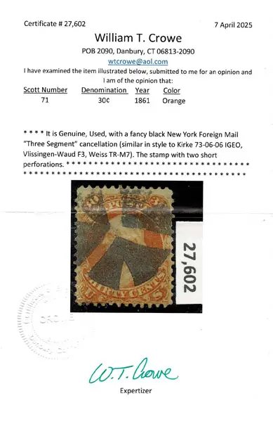 O UNITED STATES: 1861 30c orange, black New York Foreign Mail “Three Segment” cancellation .two short perforations . Crowe Cert.(2025).