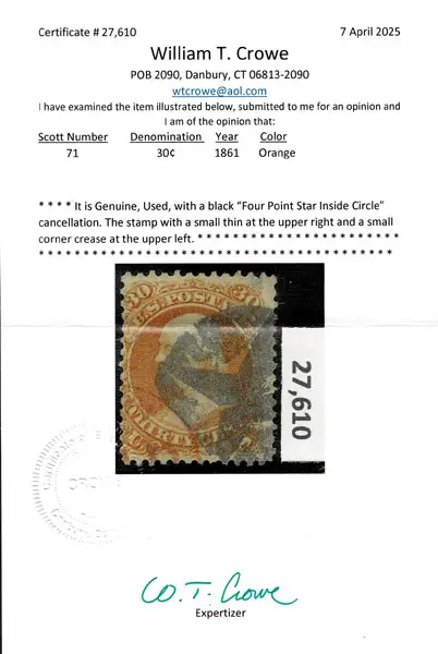 O UNITED STATES: 1861 30c orange, used with black “Four Point Star Inside Circle” cancellation ,small thin and crease . Crowe Cert.(2025).