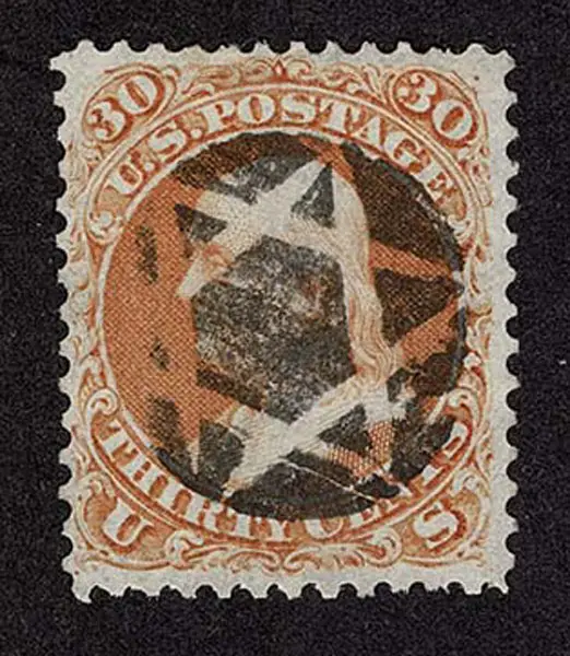 Lot 146 – UNITED STATES: 1861 30c orange, used with “socked on nose” black negative “Star of David” cancellation