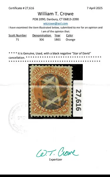 O UNITED STATES: 1861 30c orange, used with “socked on nose” black negative “Star of David” cancellation ,well place cancel . Crowe Cert.(2025).