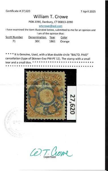 O UNITED STATES: 1861 30c orange, used blue double circle “BALTO PAID” cancellation ,small tear and thin socked-on-nose . Crowe Cert.(2025).