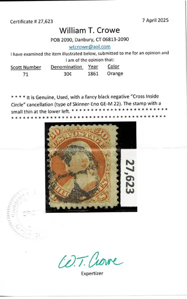 O UNITED STATES: 1861 30c orange with black negative “Cross Inside Circle” cancellation ,small thin . Crowe Cert.(2025).