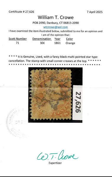 O UNITED STATES: 1861 30c orange with black multi-pointed star type cancellation ,small corner creases . Crowe Cert.(2025).