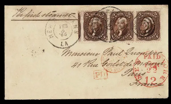 UNITED STATES: 1863, Used to France,5c brown STRIP OF THREE with most interesting error at left , guide or center – line and imperforate between the adjacent partial stamp, all tied by NEW ORLEANS FEB 5 65 LA and target strikes on neat off white envelope bearing red NEW YORK, PAID 12 transit, red boxed PD and red French 5 Mars . Ex Mandel.