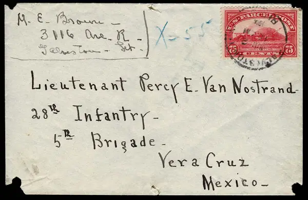 UNITED STATES: Parcel Post; 1913 75c carmine rose . Tied by GALVESTON TEX JUN 2 1914 c.d.s.on a normal envelope, hearing blue crayon manuscript “X-55”, Appropriate spindle holes for mounting on parcel. Addressed to a Lieutenant in the 28th Infantry/5th Brigade district in Vera Cruz, Mexico. Van Nostrand remained in the military until his death in 1938 rising to the rank of Colonel . Foundation Cert. (2025).