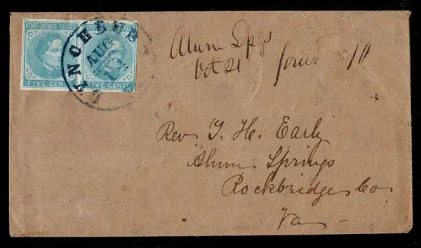 UNITED STATES: Confederate State, 1862 5c light blue PAIRS on each face of “Turned Cover” :both margins all around and tied respectively by black grid cancels with FARMVILLE AUG c.d.s. and blue LYNCHBURG AUG 14 VA c.d.s. with manuscript “forward 10 Oct 21” to Rickbridge .