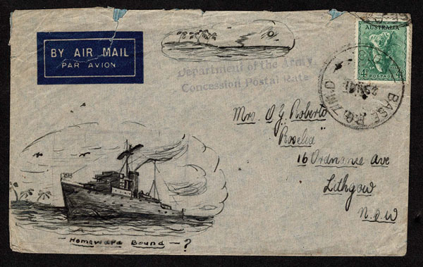 Lot 210 – AUSTRALIA; WWII Military Mail; 1937 -46: Hand-drawn “Homeward Bound” ship and dreamy island