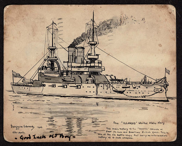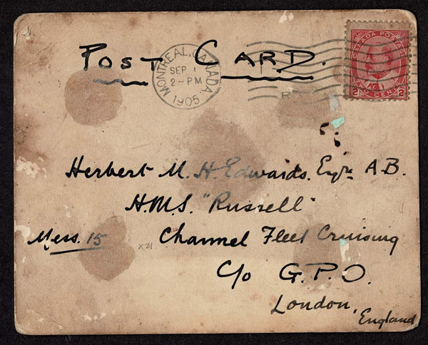 CANADA: 1905 Hand-drawn picture of the U.S.S. Illinois (BB-7) on postcard .drawn by Burgoyne Edwards in pen and ink presumed by his note, based upon a photograph, with notations about its firing power. Written to Herbert Edwards on the HMS Russell. The card bears a 1902 2c red tied by a MONTREAL SE1 1905 duplex cancel (some soling). Good Luck Old Boys”, See the next lot for a companion cover .