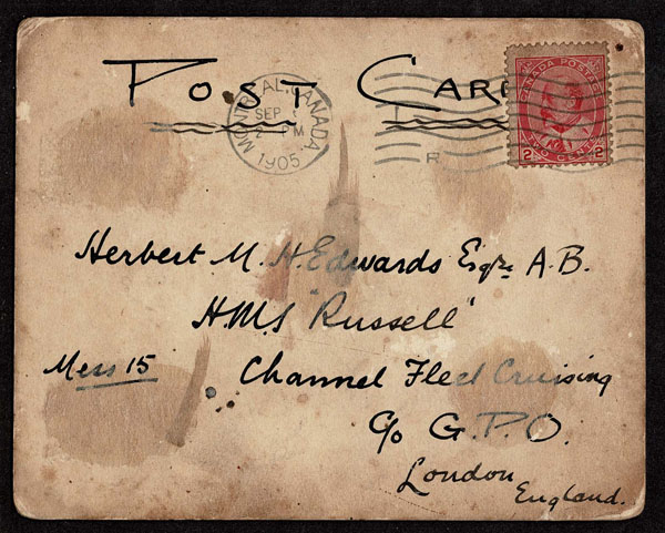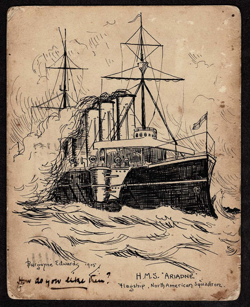 CANADA: 1905 Hand-drawn picture of the H.M.S. Ariadne (M65) on postcard .drawn by Burgoyne Edwards in pen and ink with notations about it being the “The Flagship of the North American Squadron” and “How do you like them? ” likely referring to the postcards. Written to Herbert Edwards on the HMS Russell. The card bears a 1902 2c red tied by a MONTREAL SE1 1905 duplex cancel (some soiling). The companion to the prior lot .
