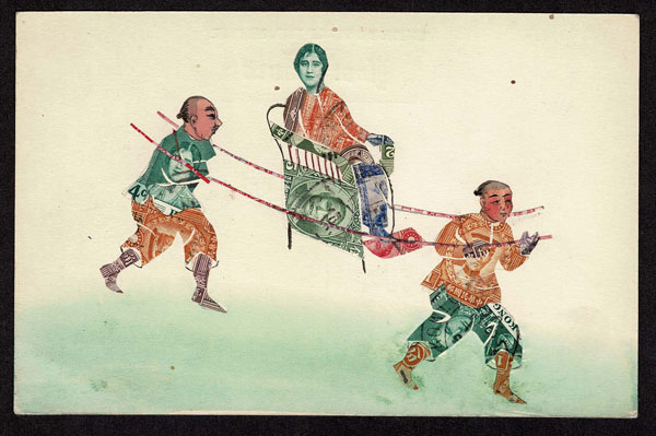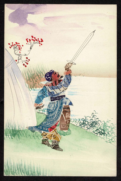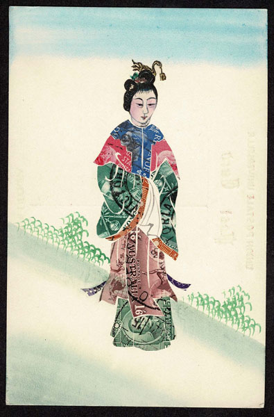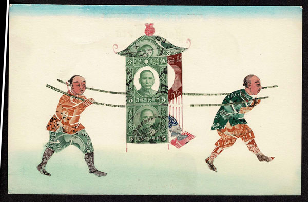 CHINA: Stamp collage SET OF FOUR unused China / Japanese themed decorative postcards .Very attractive set of for oriental / Asian themed decoupaged postcards made from used stamps. 1) Litter (horizontal) 2) Sedan Chair (open Litter) (horizontal), 3) Gentleman with sword (vertical) and 4) Lady (vertical) . Suitable for framing. The art of decoupage is appreciated by both philatelists and non-collectors. Quite collectable – see how many stamps you can identify .