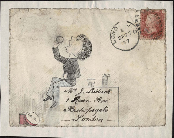 GREAT BRITAIN: 1877 hand-drawn black pen and colored mounted front; a man sitting on a table ready to take ” the pill “ .presumably from the open canister. Drawn in pen and hand colored, addressed to again to Mrs. J. Lubbock. The front is stamped with a 1d red tied with LONDON SP 27 77 duplex .