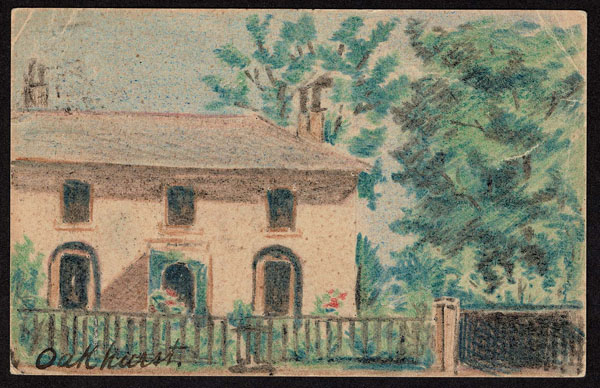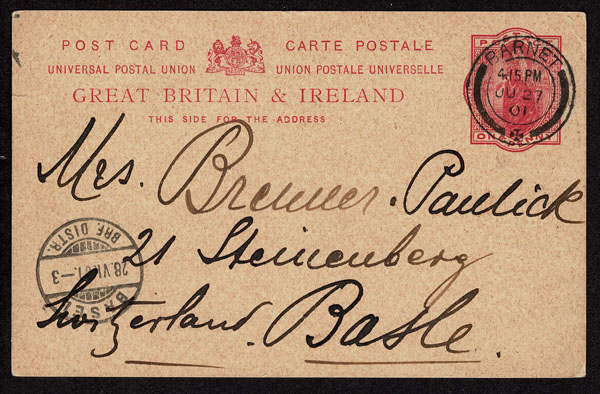 GREAT BRITAIN: 1901 postal card (2 corner creases) used to Switzerland with hand-drawn colored picture of a house .The two story house is titled Oakhurst addressed to Mes. Brewuer Paulick(?) in Basel. The postcard is canceled with BARNET JU27 c.d.s. and BASEL receiver Very lovely .
