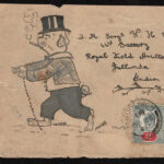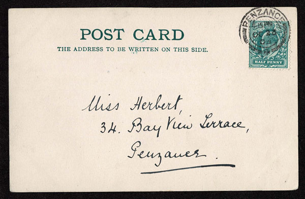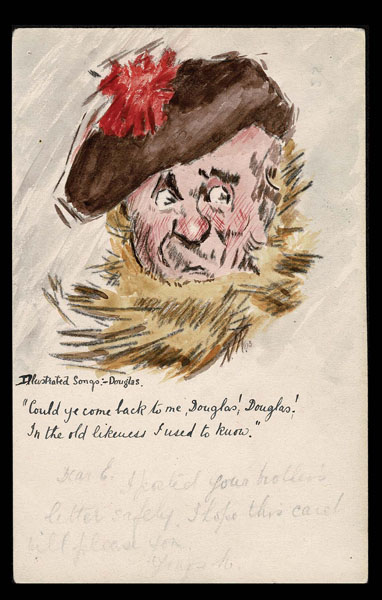 GREAT BRITAIN: 1904 Local Postal Card with hand-drawn and colored old time Scottish face , beard and hat with pen notation, ” Illustrated songs Douglas and quoted, Come back to me, Douglas, Douglas! In the old likeness I used to know”. Also a notion to “E” to let her know that he posted her bother’s letters. The card bears a 1/2 d green adhesive, tied to card by PENZANCE OCT 23 c.d.s. Very interesting .