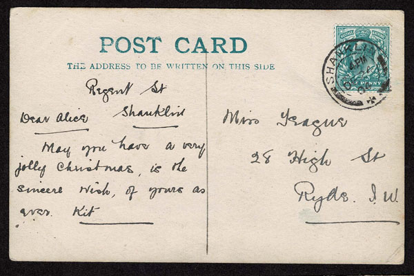 GREAT BRITAIN: 1904 wonderfully drawn and colored navel scene by K.B.. .Sent to Miss Yeagur in Rydo S.W. bearing a 1904 green 1d tied to the card by a SHANLIN DE 24 04 c.d.s. with a Christmas greeting from Kit .
