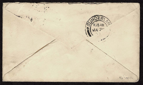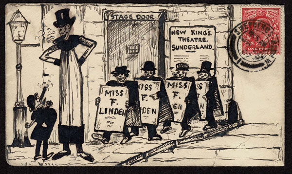 GREAT BRITAIN: 1907 pen and ink drawing of a giant man standing up to a little man boss. .Four billboards carry the recipient’s name, “Miss F. Linden” and the cover is sent to the New Kings’ theater in Sunderland bearing a 1907 1p red tied with a SHEPHERDS BUSH JA 21 c.d.s., backstamped SUNDERLAND JA 25. A wonderfully illustrated cover .