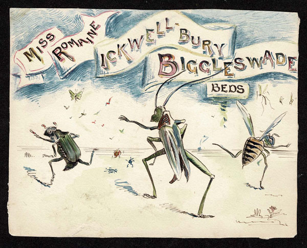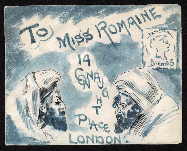 GREAT BRITAIN: Two hand-drawn and colored fronts one depicting Arabs and a 5c stamp, the other has bed bugs .Both covers are addressed to “Miss Romaine”. The Arabs is addressed to 14 Connaught Place in London. 12,13,14 Connaught Place was also known as “Stanhope House” built in 1899?1901 to a design by W. H. Romaine-Walker and Francis Besant . The second front shows “bed bugs” and is addressed to Ickwell Bury Biggleswade, a property in Bedfordshire a large estate which once was home to the Horton Preparatory School, which may explain the subject of this front. Two interesting historic pieces .