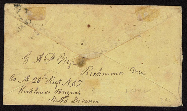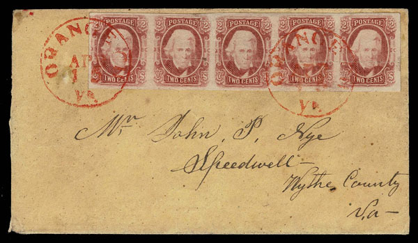 F UNITED STATES: Confederate States; 2c brown red STRIP OF FIVE ,”tied” by red ORANGE VA c.d.s. strikes on genuine envelope on reverse manuscript Co. A 26 Regt N67 Kirklanus Brigade, Hicks Division. Quite impressive .