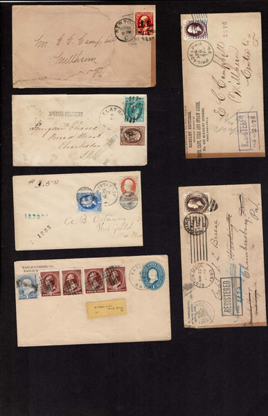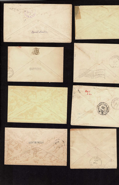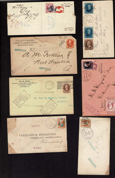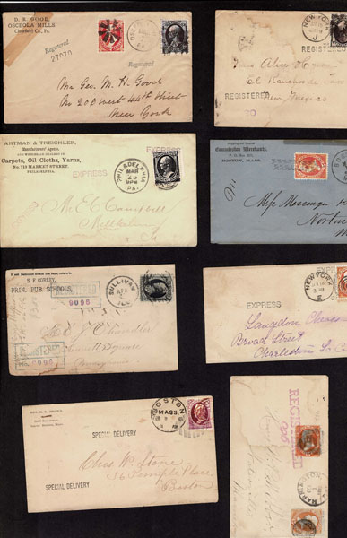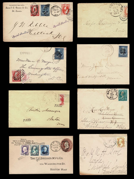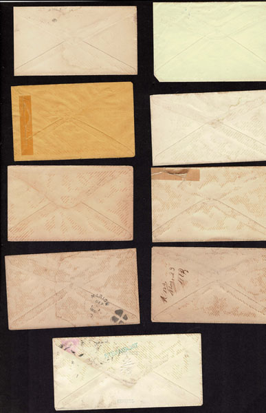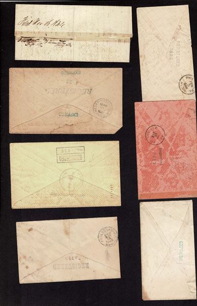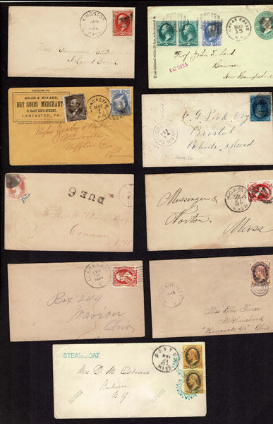 UNITED STATES FORGERIES & FANTASIES: Bank Note Issues; 43 covers .values to 90c great variety of postal markings, 3 bisects, some of the colors are quite off, but imaginative and some lower values genuine .