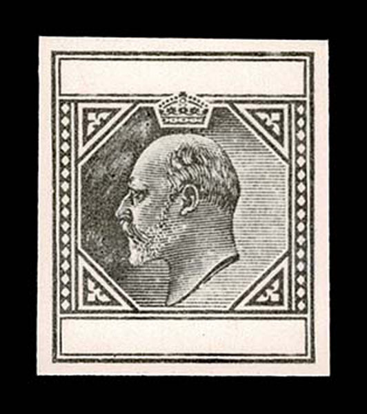 SR SPERATI Reproduction of the King Edward VII completed design proof .omitting country name and value tablet blank, stamp size and bearing violet “SPERATI REPRODUCTIONS” hand stamp on reverse, very fine. Scarce . Ex Maisel.