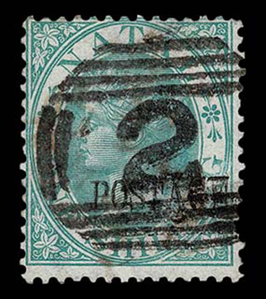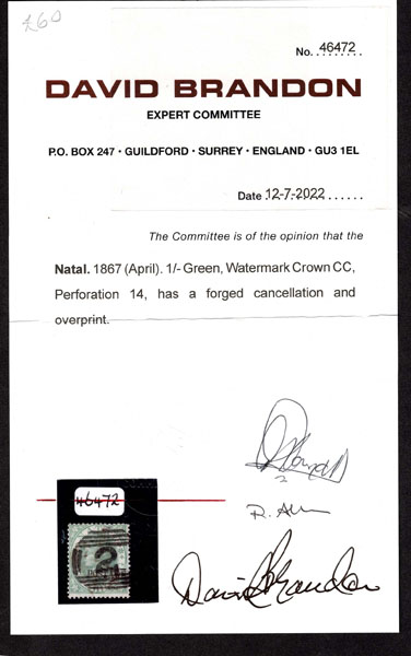 F FORGERIES & FANTASIES: Natal; 1870 curved “Postage” overprint in black .on Queen Victoria 1 s green overprint and cancel forged, but very nice job . Brandon Cert (2022).