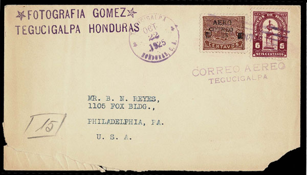 F FORGERIES & FANTASIES: Honduras 1925 25c on 20c brown .”tied” by purple bar cancel on envelope (corner damages) to U.S. . Ex Boonshaft. Friedl Cert. (1983 as fake).