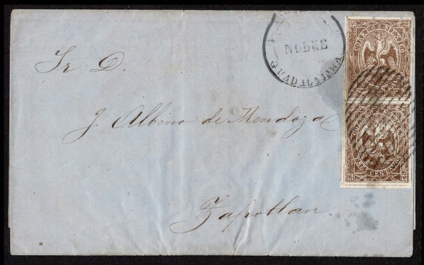F FORGERIES & FANTASIES: Mexico: 1864-66 Eagle. 3c yellow brown, No overprint (remainder) guideline PAIR .full margin “tied by GUADALAHARA c,d,s, and grid cancel, light stain, very creative . (18a var. $1400 if genuine).