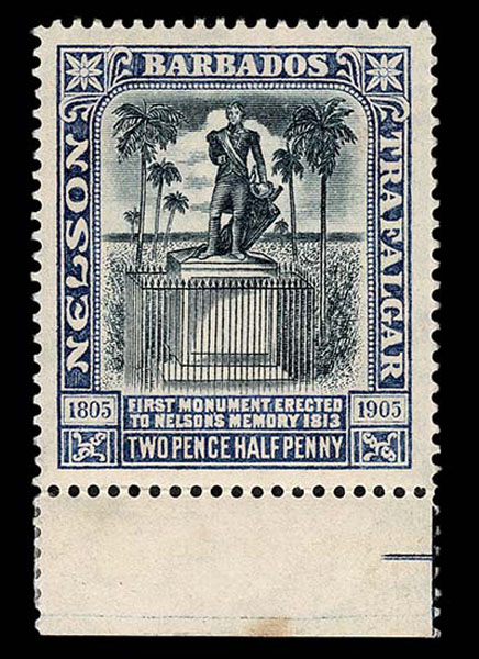 Lot 339 – BARBADOS: 1907 Nelson Centenary, 2 1/2d black & Indigo, never hinged, Bottom Sheet Margin Copy