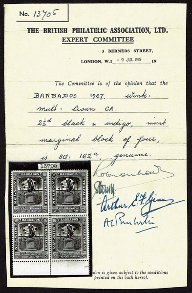BARBADOS: 1907 Nelson Centenary, 2 1/2d black & Indigo, never hinged, Bottom Sheet Margin Copy ,superb, B.P.A. Cert (1949) photo copy of the block of four, this being the bottom right stamp . ( SG 162a ?700) (112a)… $825