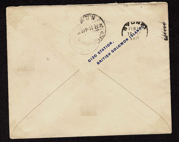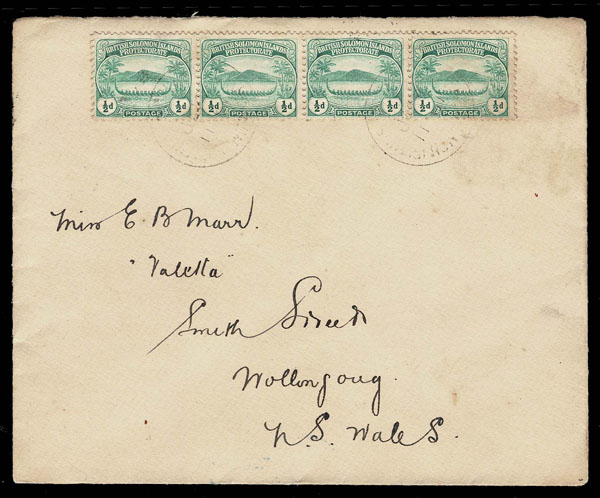 BRITISH SOLOMON ISLANDS: 1908-11 1/2d green STRIP OF FOUR ,tied by indistinct JA 8 (1911) c.d.s. strikes on off-white envelope (cover flap secured with hinges) , on reverse printed GIZMO STATION (BSI) and SYDNEY FEB 11 transit and Wollongong 16 FEB 11 receiver . Ex. Bromberg.