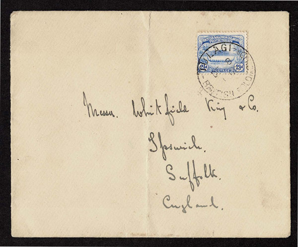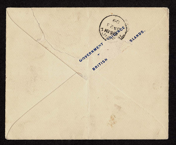 BRITISH SOLOMON ISLANDS: 1908-11; 2 1/2d ultramarine .Tted by TULAGI DE 8 1909 c.d.s. on and off-white envelope (top back flap tear) on reverse, manuscrpt Government Residence to Whitfield King and Co, a stamp gentleman dealer in Ipswich England with Ipswich receiver . Ex. Bromberg.