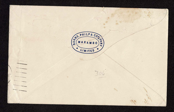 Very rare destination. Burns, Phillip was formed in the 1870s and originally concentrated on Australian passenger and cargo coastal trade. In the 1890s trade expanded to the Pacific Islands. The company survived in shipping until 1970 by which time it had disposed of most of its ships and diversified into other industries. They purchased Makambo Island for $30 pounds in 1908 to become to company headquarters in the Solomon Islands.