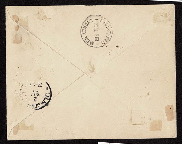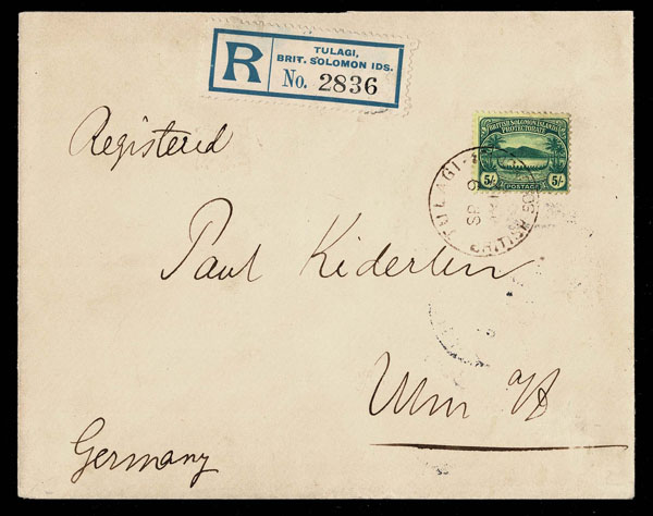 BRITISH SOLOMON ISLANDS: Used to Germany, 1910 5sh green on yellow tied by TULAGI SP 9 BRITISH SOLOMON IDS c.d.s on registered envelope bearing blue R label, on reverse, SYDNEY 28 SE 12 REGISTERED and ULM 2 NOV12 receiver . Ex. Bromberg.
