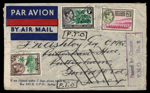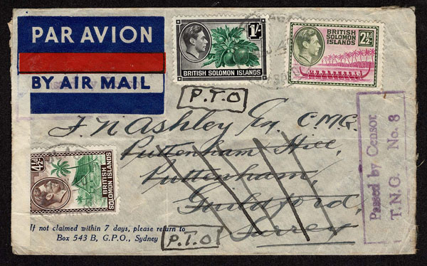 BRITISH SOLOMON ISLANDS: Used to England; 1939 2 1/2d, 4 1/2d. 1s George V issue ,tied by faint TULAGI JU40 c.d.s. strikes on AIRMAIL envelope bearing violet boxed “PASSED BY Censor T,N.G No. 8 handstamps, envelope re-addressed in England from Guilford to Ipswich on reverse “P.T.O.”, also duplicate censor handstamps and FELTENHAM 12 SP transit. Blue Burns Philip & Co printed oval with “Sydney” crossed out and Makamno written in. Very rare combination and usage . Ex. Bromberg.