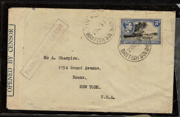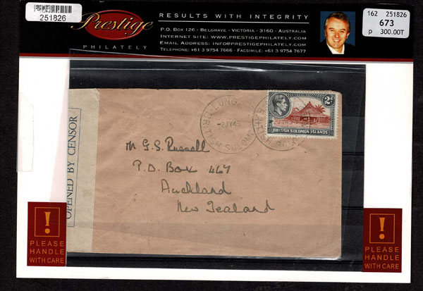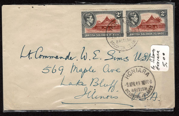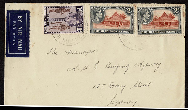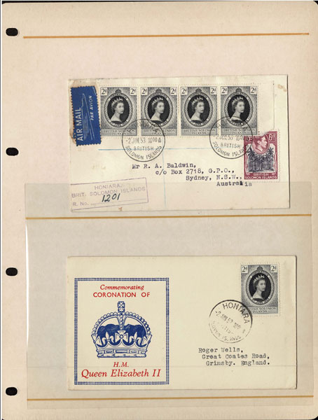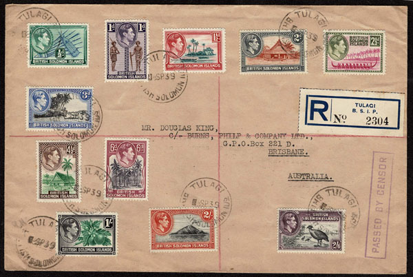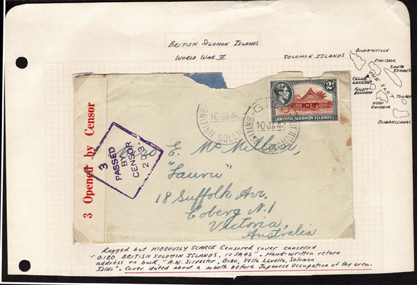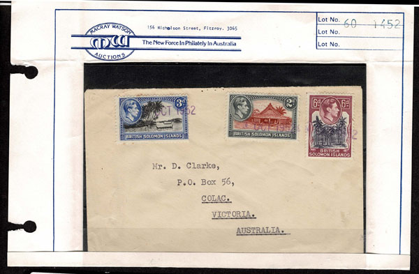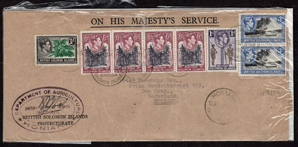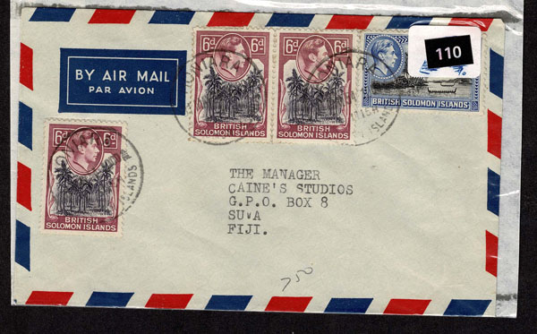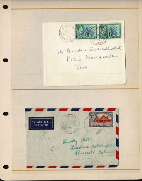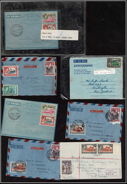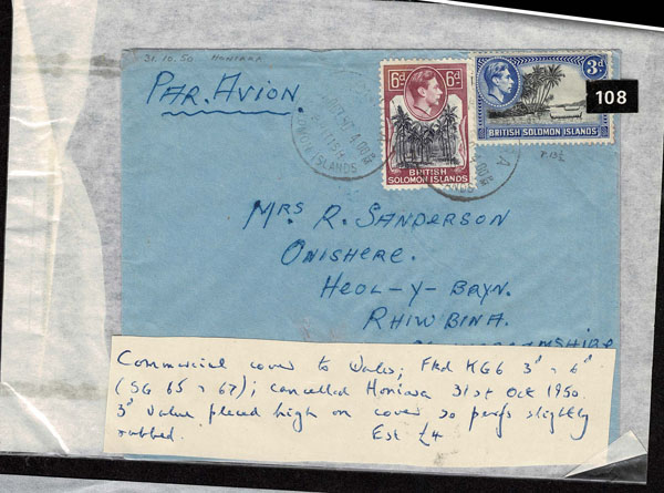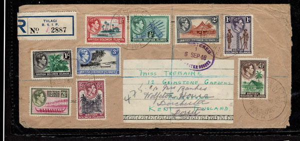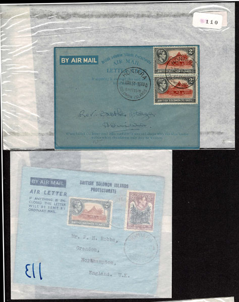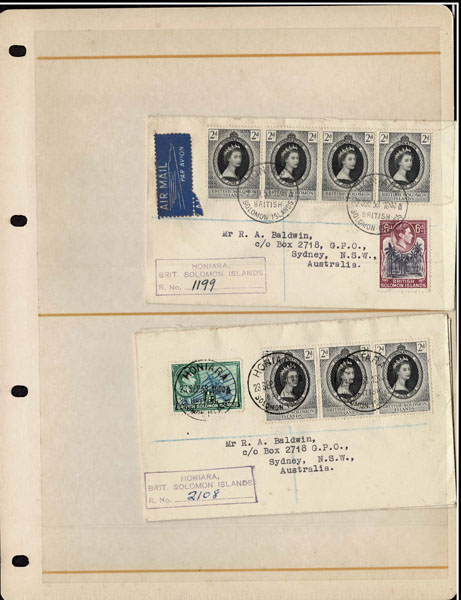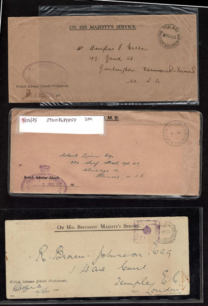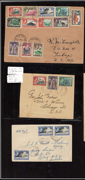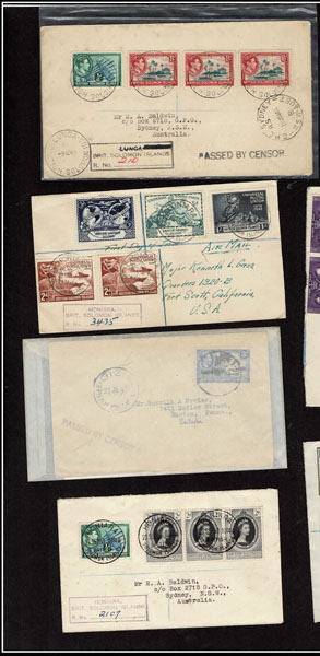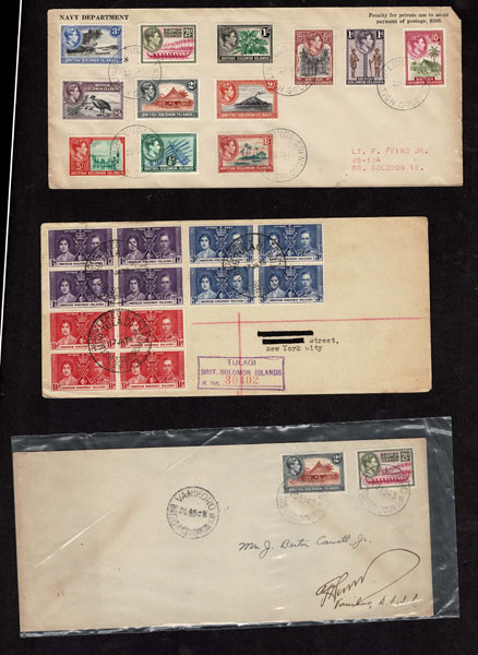 BRITISH SOLOMON ISLANDS: 1913 to 1935 George VI Issues; 180+ covers running the gamut of the pre and post war issues . Fabulous multiple frankings from many islands, O.H.M.S., censured, destinations, a C.P.U. presentation booklet, a few on auction lot sheets, Prestige, Victoria. Well worth a look online . Ex. Bromberg.
