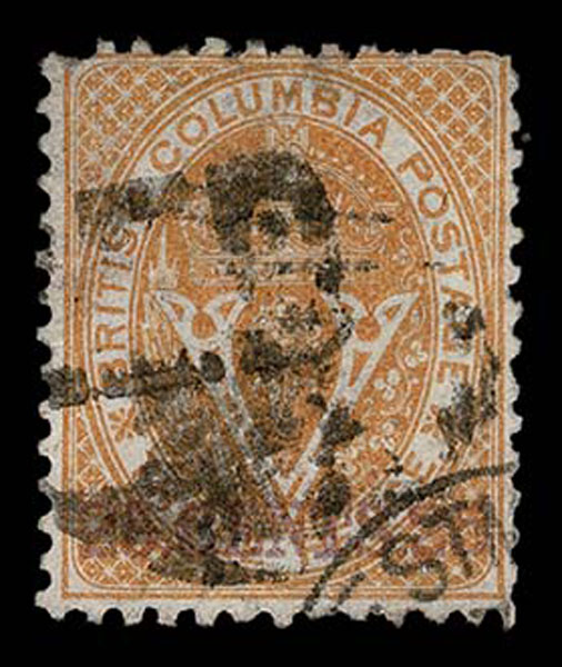 O BRITISH COLUMBIA: 1869 25c on 3p orange ,indistinct cancels, couple of irregular perforations as usual, fairly well centered for this issue , fine. (16)… $850
