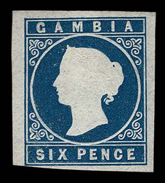 GAMBIA: 1869 4p pale brown and 6p blue ,, o,g, hinge remnant, margins large to touching (4p), fresh colors , fine 2 copies. (1,2,)… $1,225