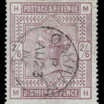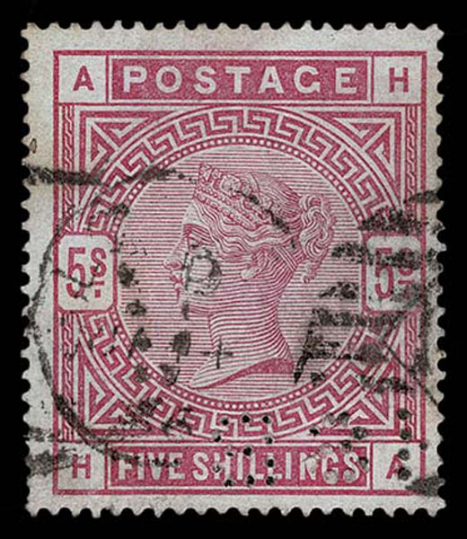 O GREAT BRITAIN: 1883-84, 5sh rose , ?.B? perfin, indistinct circular and grid cancels, fresh color , fine and rare. (SG 176)… £4,000