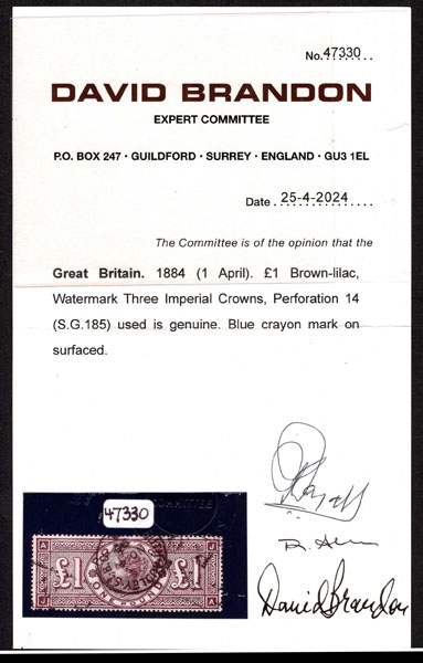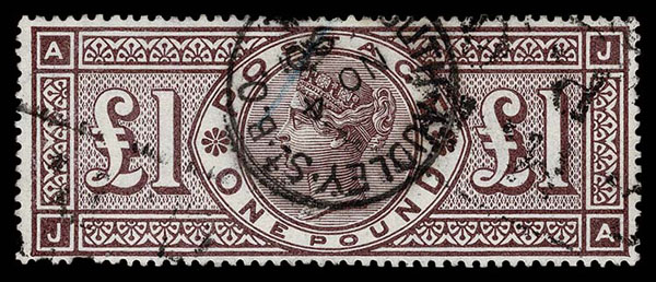 O GREAT BRITAIN: 1884, ?1 brown lilac,crisp SOUTH AUDLEY ST NO4 ,1890 c.d.s. and very faint ?blue crayon mark?, bright color, well centered , very fine. Brandon Cert, (2004). (SG 185)… £3,000