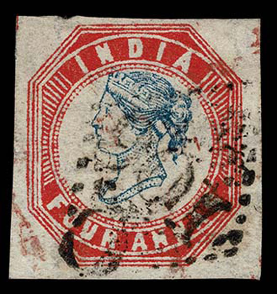 O INDIA: 1854 4a blue & red, Head die III ,Frame die II indistinct cancel, good margins all around , very fine. (SG 23 ?750 (6F)… $575 SG